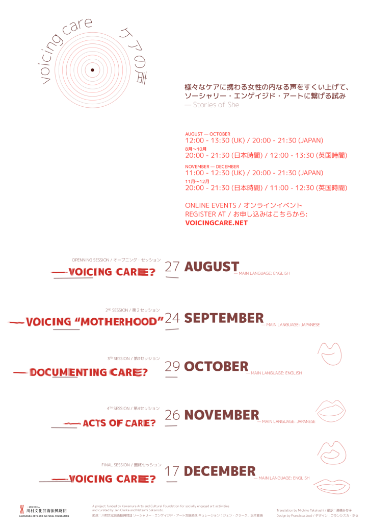 Between August and December 2021, we are holding a series of bilingual (English and Japanese) virtual events, discussing themes around art, care, and motherhood with invited guests and participants. Together, we are investigating and developing feminist approaches to socially-engaged art, focussing the concepts of care and recovery, addressing what socially engaged art is and can be in Japan and Europe, after Covid.