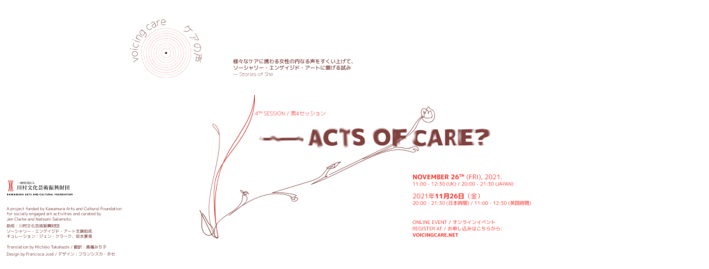 「ケアの声」の4回目となる今回は、ケアの行為としてのアートとデザインを探求する機会となります。これは日本の華道、「花を生ける」という行為からヒントを得たもので、仏教では「慰めの行為」として解釈されています。 ケアの行為としてのアートの実践では、どのようなケアが扱われ、関わっているのでしょうか。